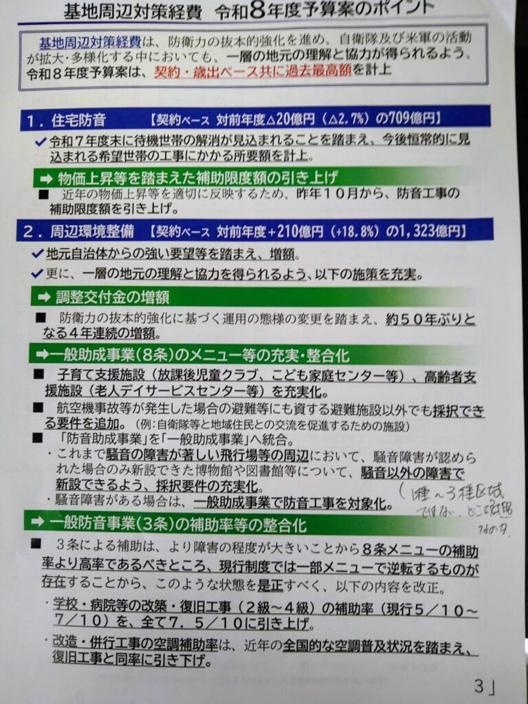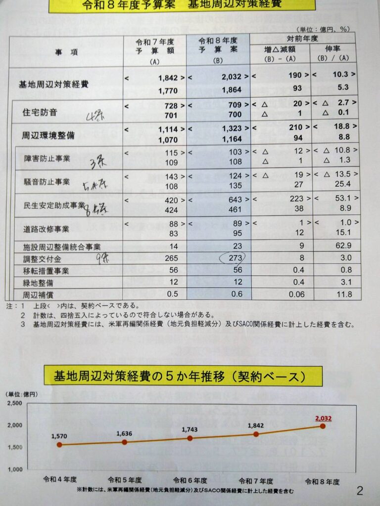 一方で、基地周辺の環境整備や調整交付金など、いわゆる「地域予算」が占める割合は、全体のわずか約2.3%にとどまっています。