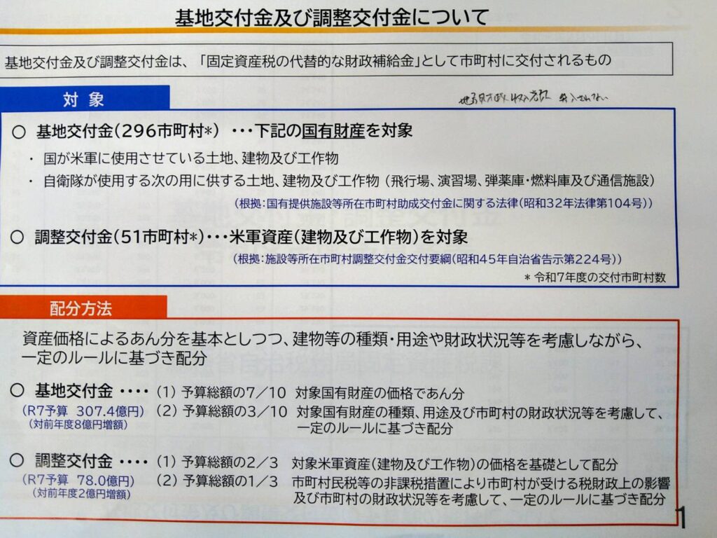 現在、防衛省の調整交付金等は「建物や工作物」が算定の中心ですが、「土地の評価」を適切に反映した制度設計こそが、地域の公平感につながると考えます。